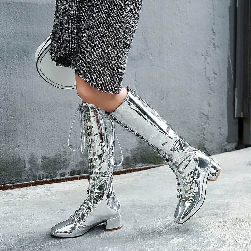 Mirror Patent Leather Silver Mid-Calf Chunky Heel Boots