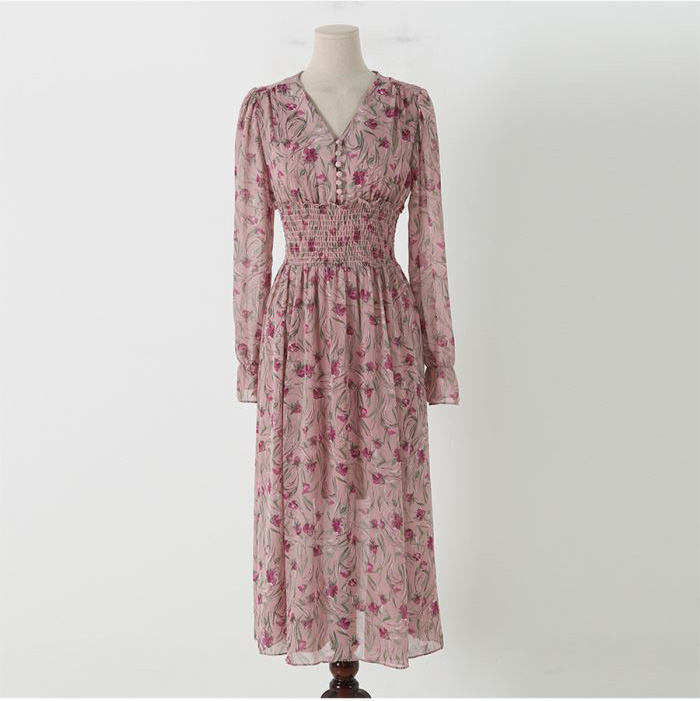 Sweet V-Neck Long Sleeve Floral Chiffon Dress